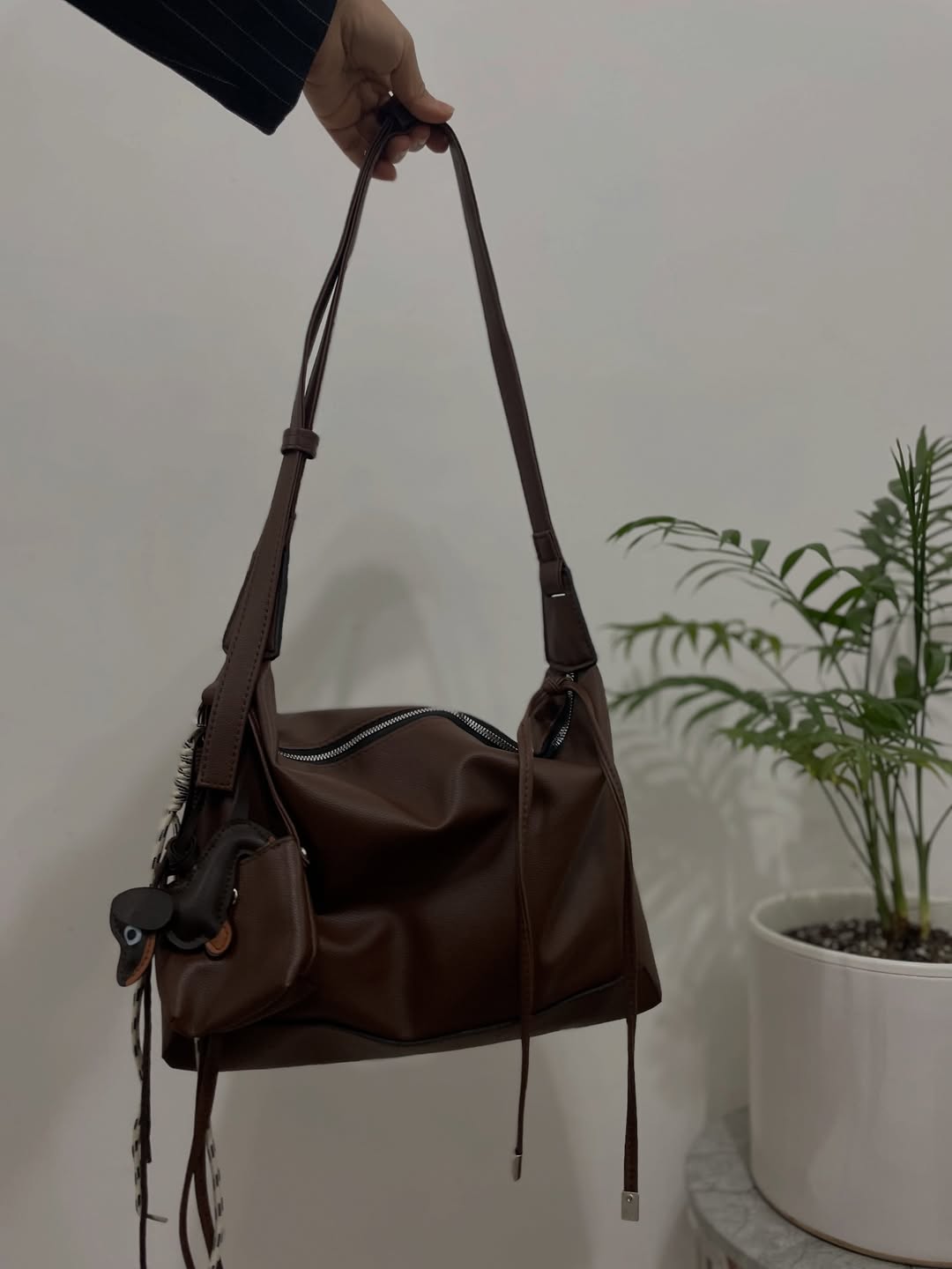 کیف جذاب مشکی /قهوه ایی با آویز متعلق به کیف و قابلیت کوتاه و بلند شدن بند. جنس چرم صنعتی.