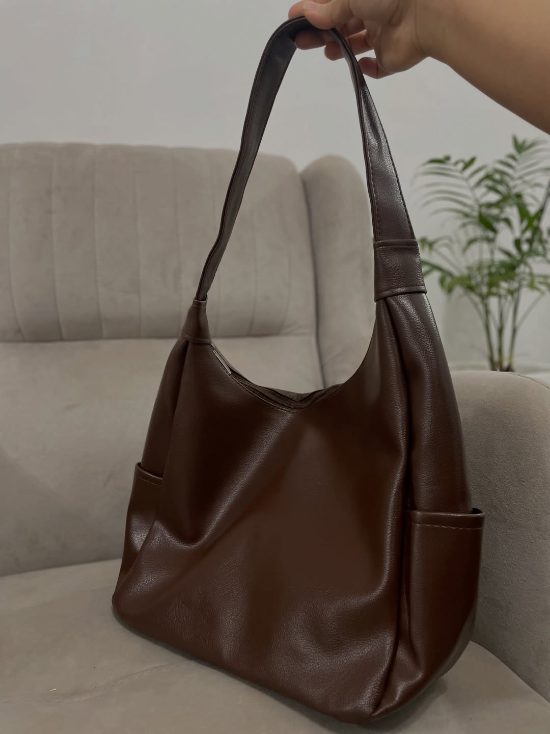 کیف دستی و دوشی چرمی با رنگهای قهوهای شکلاتی، سرمهای و مشکی نرم و سبک. مناسب برای استایلهای پاییزی و روزمره. ترکیب شیکی از سادگی و ظرافت با بند گرهدار.